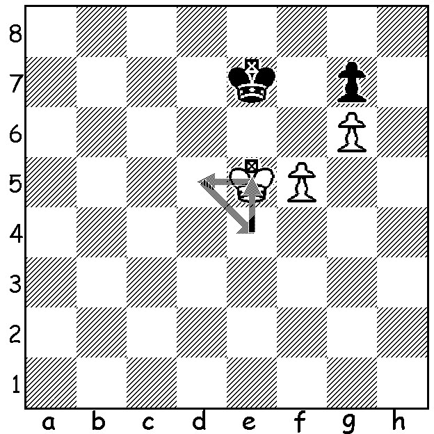 In the given position if it black to move then white can win easily as he has opposition but what if white has to move in the same position. Direct progress is not possible for example f6 then…Kf8! Draws.